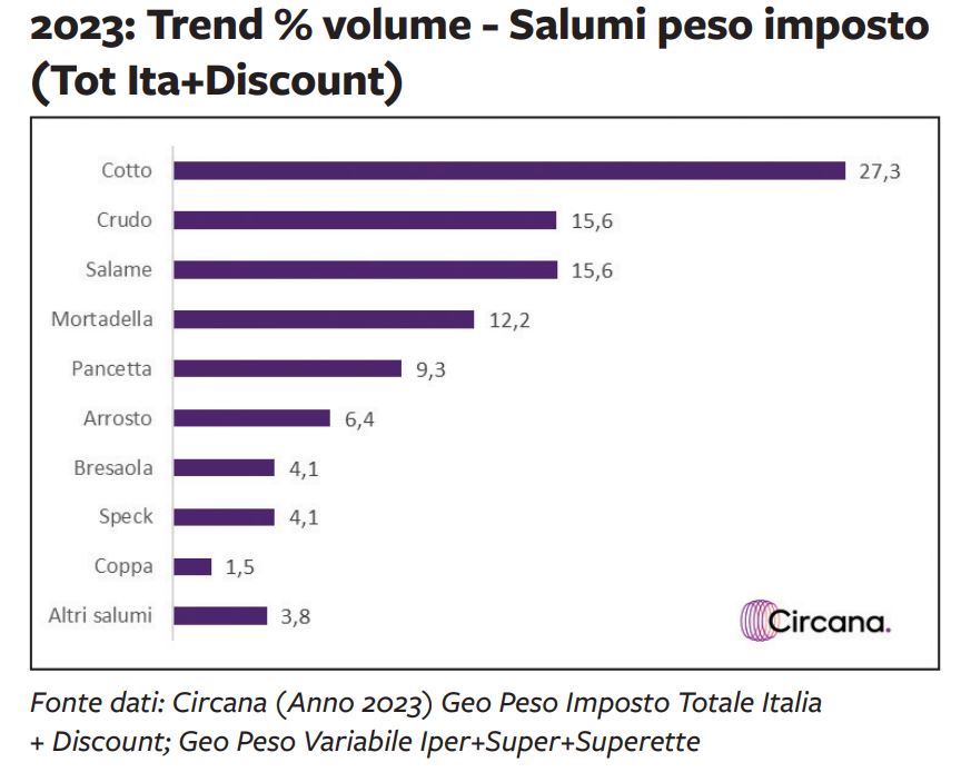 I salumi sono uno dei mercati principali del largo consumo: nel 2023 il fatturato è stato di circa 7 miliardi di euro, con oltre 382.000 tonnellate di venduto. Questi numeri includono sia la parte a peso imposto, dove il perimetro di riferimento è il Totale Italia+Discount, sia il peso variabile, rilevato invece sui punti vendita Iper+Super+Superette.