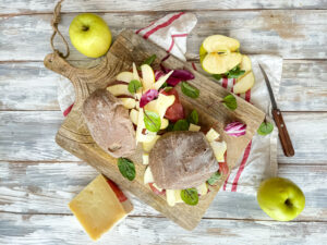PANINO TRELAValtellina Casera giovane, insalata variegata, mela golden a fette sottili, Bresaola della Valtellina IGP, pane di segale