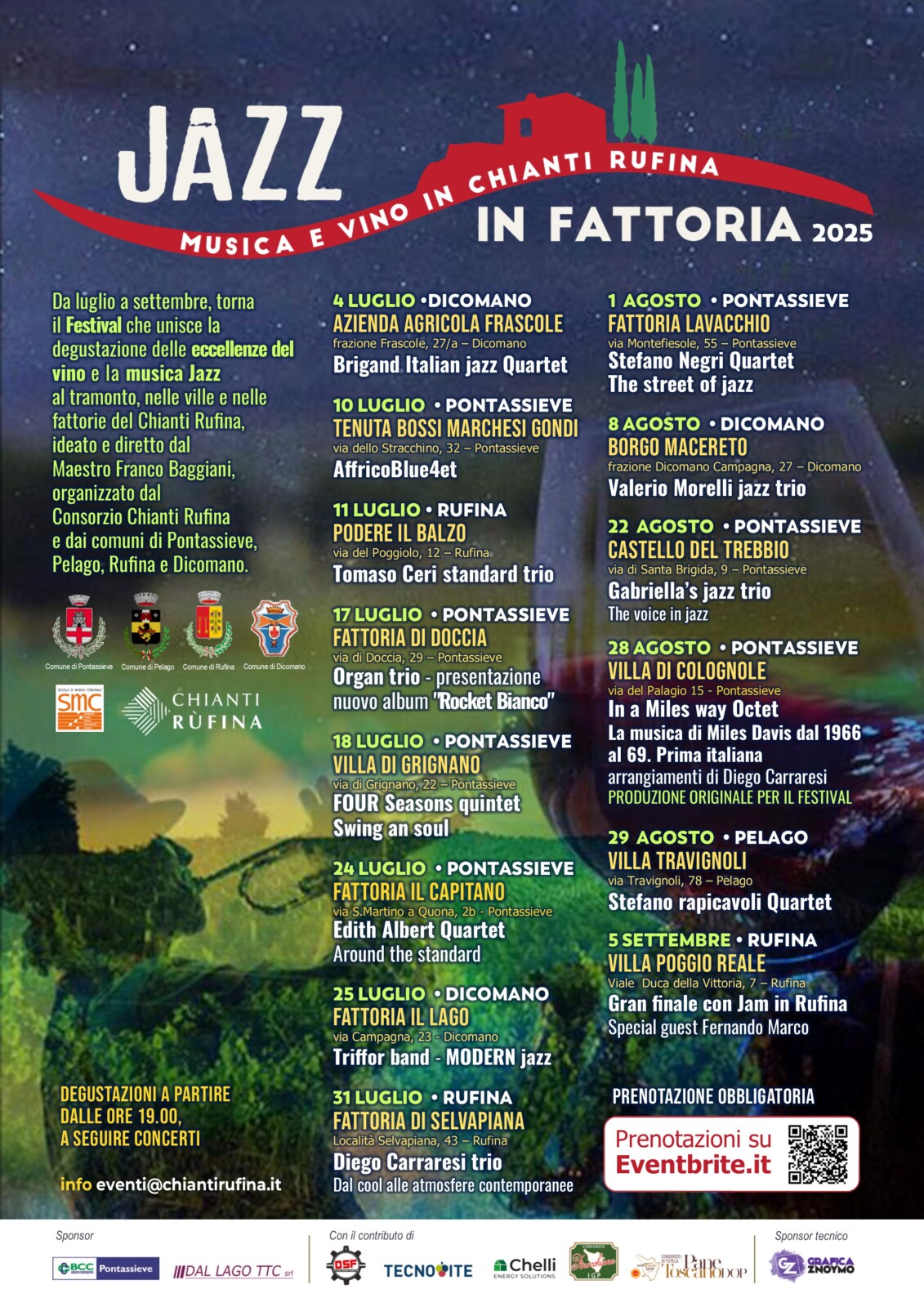 Il progetto – curato nella direzione artistica dal musicista Franco Baggiani – propone un percorso tra le eccellenze culturali e produttive della zona, attraverso un format collaudato che prevede, per ogni serata, degustazioni di vini e prodotti tipici dalle ore 19.00 alle 20.30, seguite da concerti jazz dal vivo. Le esibizioni spaziano dal jazz tradizionale alle contaminazioni moderne, con la partecipazione di ensemble e artisti di rilievo nazionale e internazionale. “Jazz in Fattoria” si conferma così un’occasione unica per riscoprire il territorio della Valdisieve in una chiave culturale e sensoriale, valorizzando al contempo il patrimonio vitivinicolo e paesaggistico. Le fattorie e le ville che ospitano gli eventi si trasformano in veri e propri palcoscenici all’aperto, dove la musica si fonde con la natura e il gusto, creando atmosfere di rara suggestione.