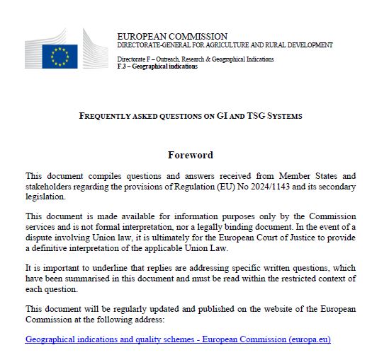 La Commissione europea ha pubblicato nel proprio portale un documento aggiornato delle domande frequenti sul sistema delle Indicazioni Geografiche alla luce del regolamento (UE) 2024/1143.