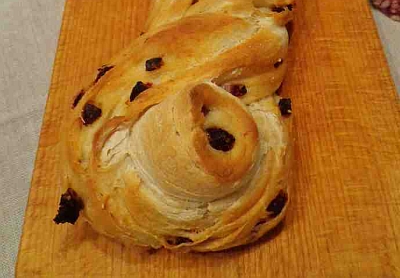 Appoggiare la treccia in una teglia foderata di carta forno, coprire con la pellicola e far riposare per circa 30 minuti. Togliere la pellicola e infornare a 220° per circa 35 minuti. La superficie deve essere dorata. Si può mangiare tiepida o fredda.
